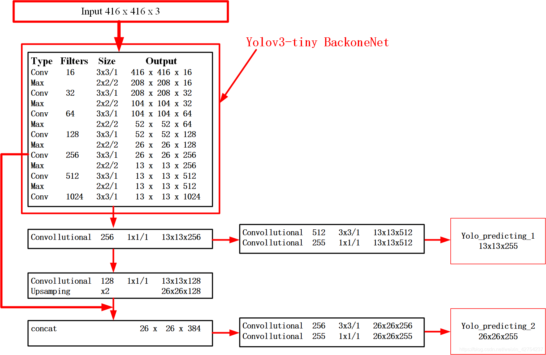 yolo3-tiny是yolo3的简化版本,主要区别为、主干网络采用一个7层conv+max网络提取特征(和darknet19类似),嫁接网络采用的是13*13、26*26的分辨率探测网络,结构如下。yolo3-tiny的优点主要是,网络简单,计算量较小,可以在移动端或设备端运行。缺点为精度也比较低(候选框和分类精度都比较低)