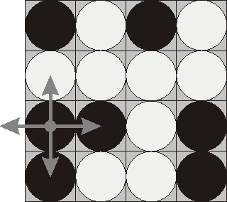 The goal of the game is to flip either all pieces white side up or all pieces black side up. You are to write a program that will search for the minimum number of rounds needed to achieve this goal.
