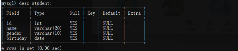 create table student( id int, name varchar(20), gender varchar(10), birthday date );