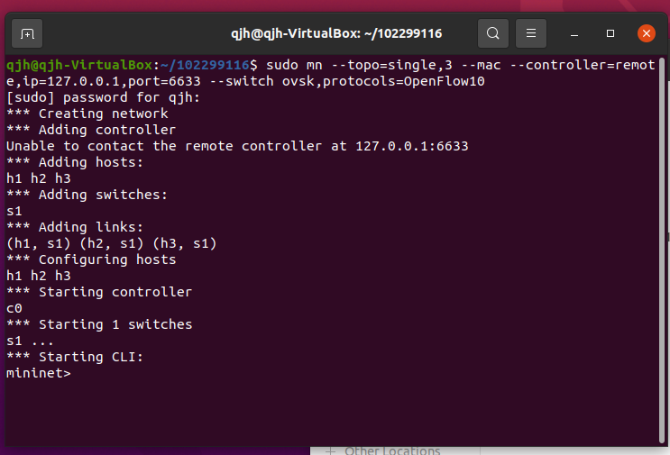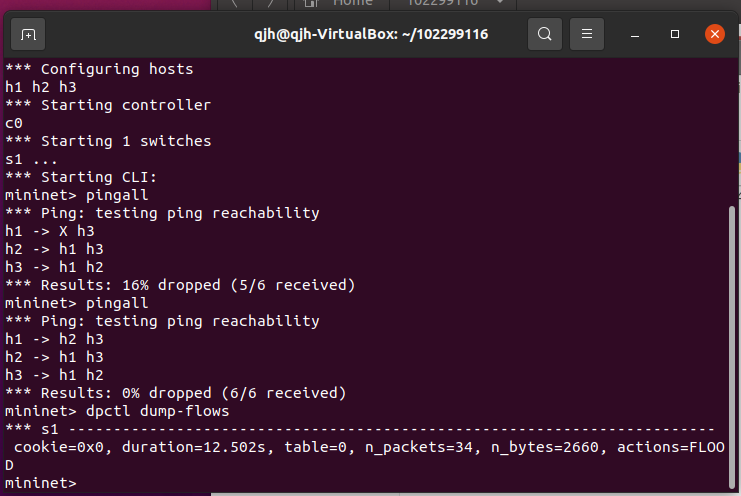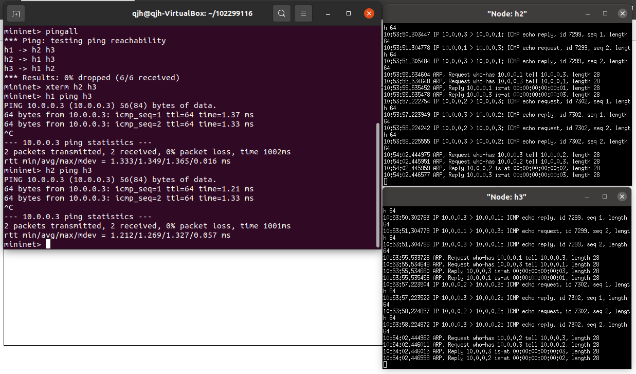 2. 阅读Ryu文档的The First Application一节,运行当中的L2Switch,h1 ping h2或h3,在目标主机使用 tcpdump 验证L2Switch,分析L2Switch和POX的Hub模块有何不同。