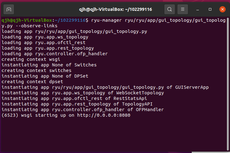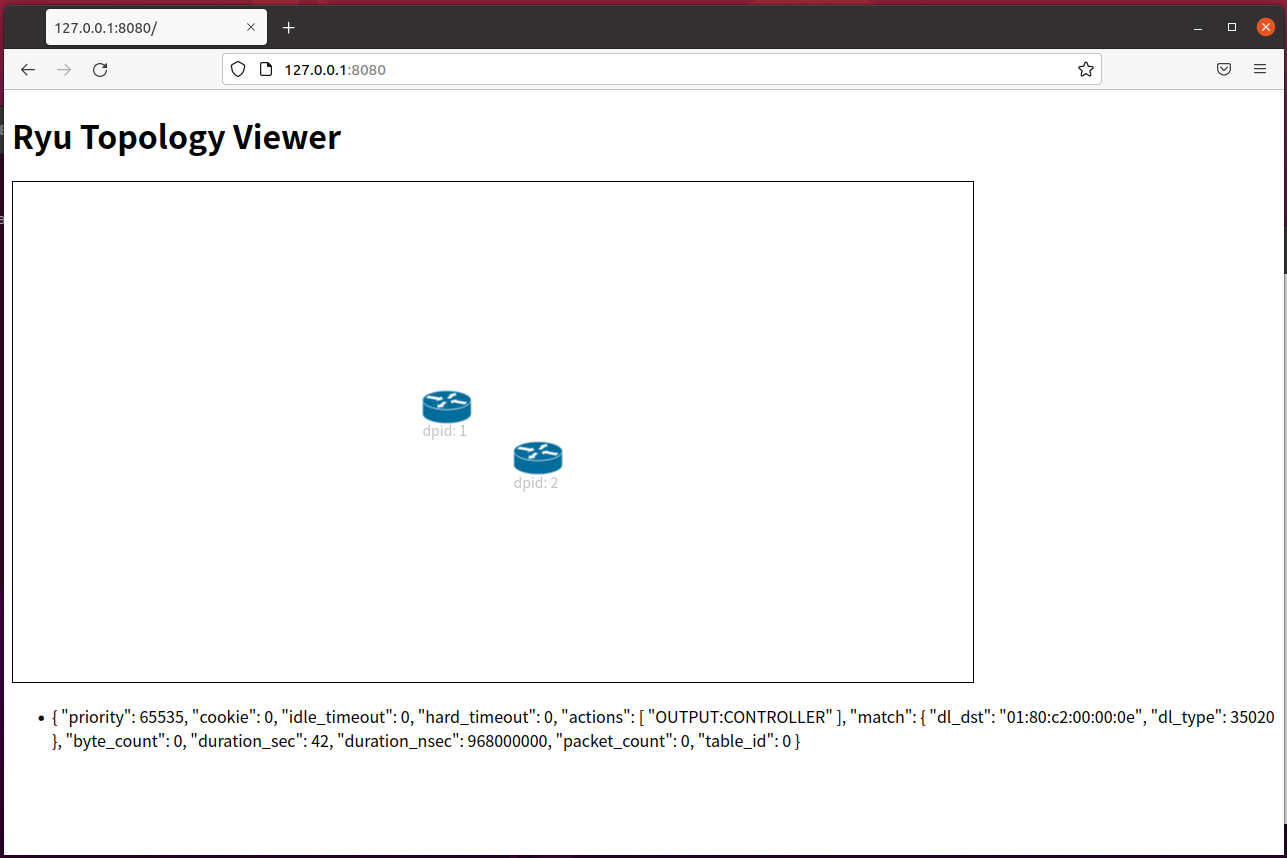 1.搭建下图所示SDN拓扑,协议使用Open Flow 1.0,并连接Ryu控制器,通过Ryu的图形界面查看网络拓扑。