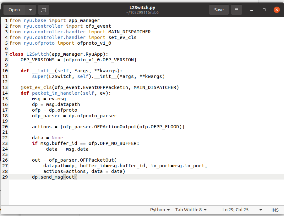 3.编程修改L2Switch.py,使之和POX的Hub模块的变得一致。