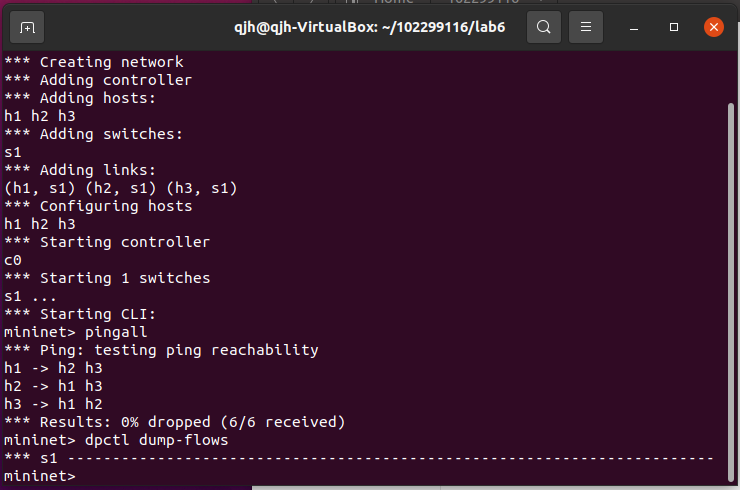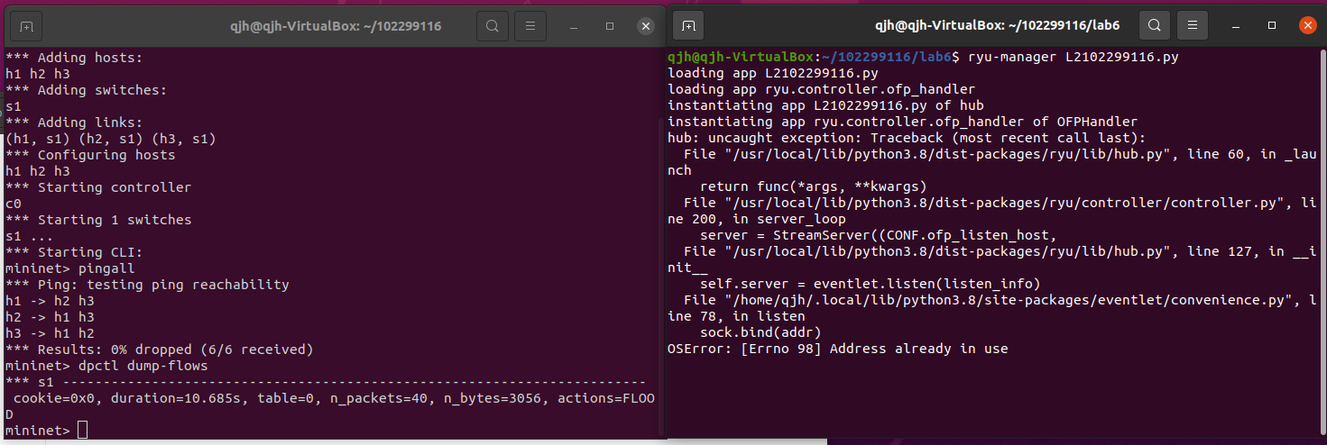 RYU的L2Switch模块和POX的Hub模块都采用洪泛转发,但不同之处在于:可以在pox的Hub模块运行时查看流表,而无法在ryu的L2Switch模块运行时查看到流表