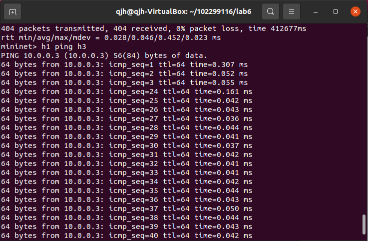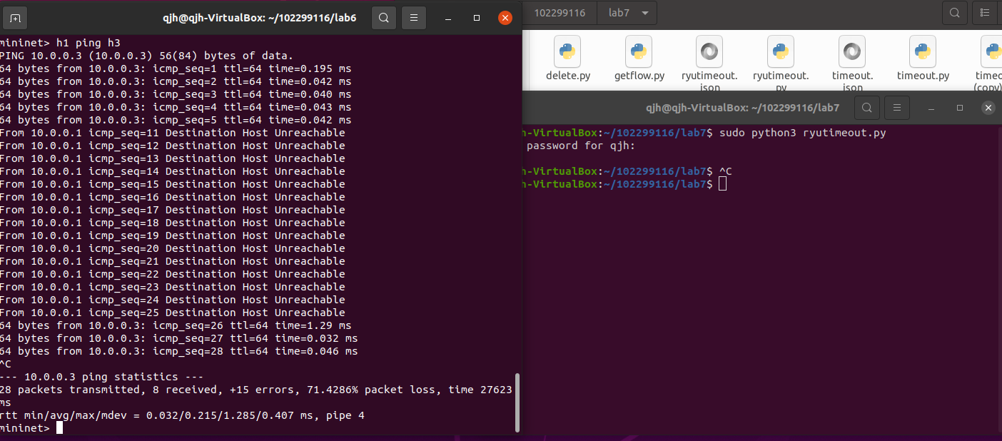 - (3).下发硬超时流表,实现拓扑内主机h1和h3网络中断20s。