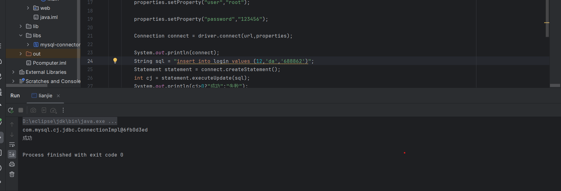 package Model; import com.mysql.cj.jdbc.Driver; import java.sql.Connection; import java.sql.SQLException; import java.sql.Statement; import java.util.Properties; public class lianjie { public static void main(String[] args) throws SQLException { Driver driver = new Driver(); String url = "jdbc:mysql://localhost:3308/登录表"; Properties properties =new Properties(); properties.setProperty("user","root"); properties.setProperty("password","123456"); Connection connect = driver.connect(url,properties); System.out.println(connect); String sql = "insert into login values (12,'da','688862')"; Statement statement = connect.createStatement(); int cj = statement.executeUpdate(sql); System.out.println(cj>0?"成功":"失败"); } public Connection getcon() { return null; } }