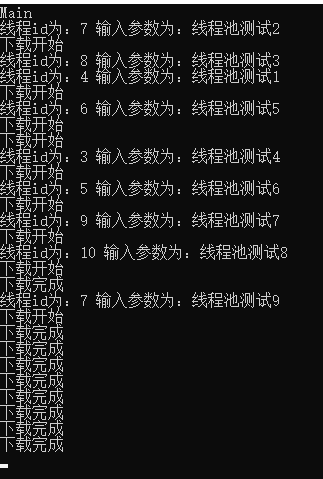 ThreadPool.QueueUserWorkItem(DownloadFile,"线程池测试1"); ThreadPool.QueueUserWorkItem(DownloadFile,"线程池测试2"); ThreadPool.QueueUserWorkItem(DownloadFile,"线程池测试3"); ThreadPool.QueueUserWorkItem(DownloadFile,"线程池测试4"); ThreadPool.QueueUserWorkItem(DownloadFile,"线程池测试5"); ThreadPool.QueueUserWorkItem(DownloadFile,"线程池测试6"); ThreadPool.QueueUserWorkItem(DownloadFile,"线程池测试7"); ThreadPool.QueueUserWorkItem(DownloadFile,"线程池测试8"); ThreadPool.QueueUserWorkItem(DownloadFile,"线程池测试9");