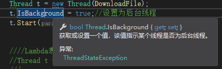 Thread t = new Thread(DownloadFile);//如果上面的参数不为object这里会报错 t.start("xxx.avi"); Console.ReadKey();