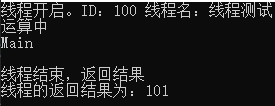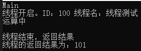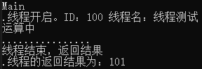 class Program { static int Test(int i, string str) { Console.WriteLine("线程开启。ID:" + i + " 线程名:" + str); Console.WriteLine("运算中"); Thread.Sleep(100);//使当前线程休眠,单位为ms Console.WriteLine("\n线程结束,返回结果"); return i+1; } static void Main(string[] args) { Func<int, string, int> f = Test;//委托指向所需开启的线程 //IAsyncResult类的对象用于取得当前线程的状态 IAsyncResult ar = f.BeginInvoke(100, "线程测试", null, null); //通过BeginInvoke开启线程。ps:.NET core 3.0不支持BeginInvoke Console.WriteLine("Main"); Console.ReadKey(); } }