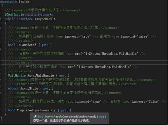 首先解释下里面的IAsyncResult接口,这个接口是用来表示异步操作的状态的。按F12可查看到: