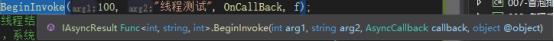 光标放在BeginInvoke上我们可以看到,对应着我们定义的Func<int,string,int>,前两个参数即是我们传递到Func中的两个参数(100, "线程测试"),都很好理解。Func指向的方法需要几个参数,BeginInvoke前面部分就需要几个参数;如果Func不需要参数,那么BeginInvoke就只有了两个参数;