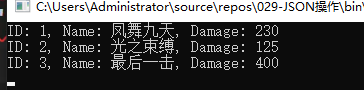 static void Main(string[] args) { List<Skill> skillList = new List<Skill>(); //使用litjson解析json文本 //两种引入Lisjson方式。1.官网下载dll程序集;2.右键引用,在管理netget程序包中下载 //这里的jsondata代表一个数组 JsonData jsondata = JsonMapper.ToObject(File.ReadAllText(@".\..\..\json技能信息.txt")); foreach (JsonData data in jsondata)//这里data代表一个对象 { Skill skill = new Skill(); JsonData IDValue = data["ID"]; JsonData NameValue = data["Name"]; JsonData DamageValue = data["Damage"]; skill.ID = Int32.Parse(IDValue.ToString()); skill.Name = NameValue.ToString(); skill.Damage = Int32.Parse(DamageValue.ToString()); skillList.Add(skill); } foreach (Skill skill in skillList) { Console.WriteLine(skill.ToString()); } Console.ReadKey(); }
