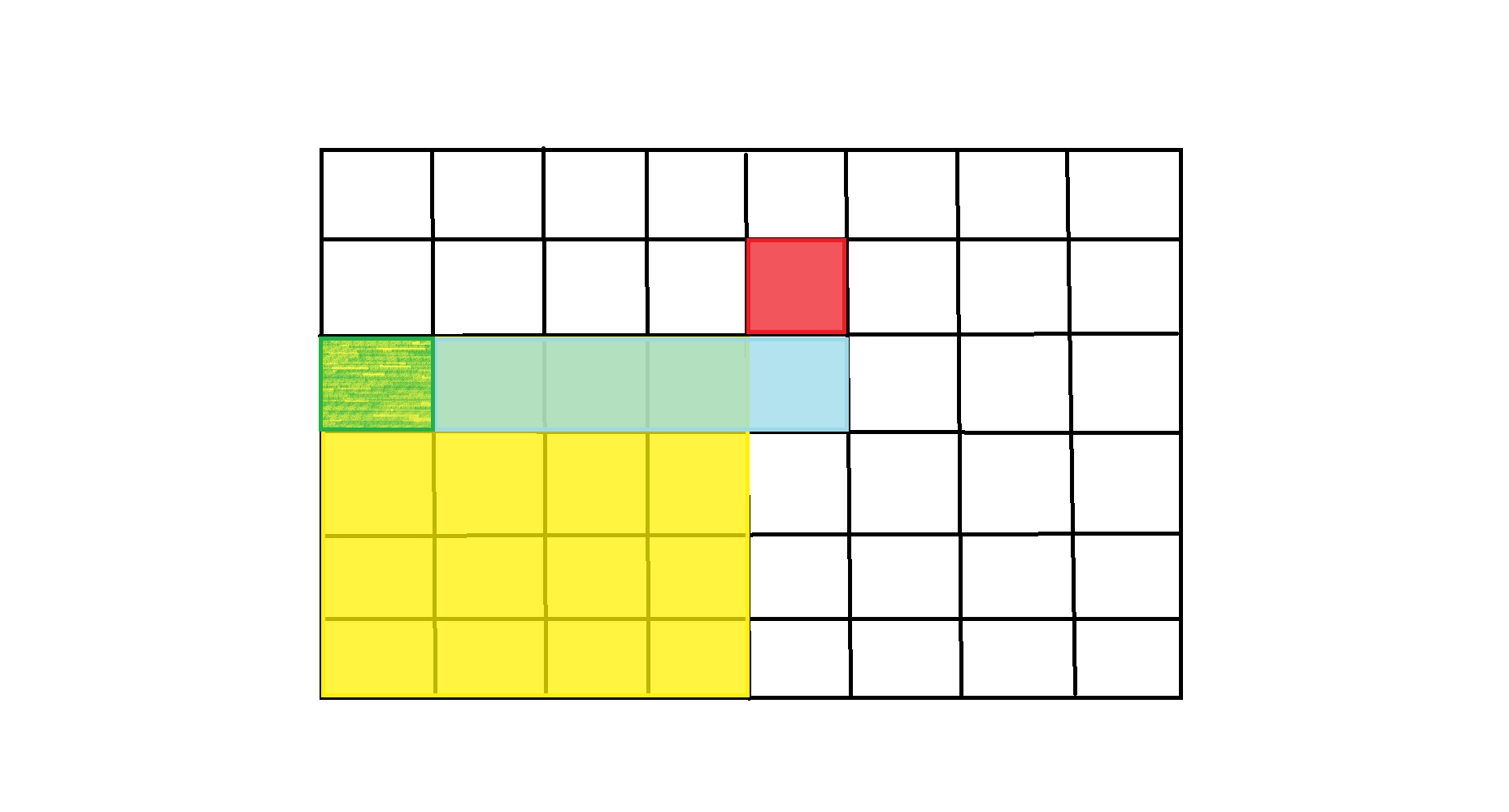 因此,可以将黄色区域的和转换成蓝色区域的和,而蓝色区域加上 \(f(r, 0) = 1\) (绿色)就等于 \(f(r+1, c+1)\) (红色)。
