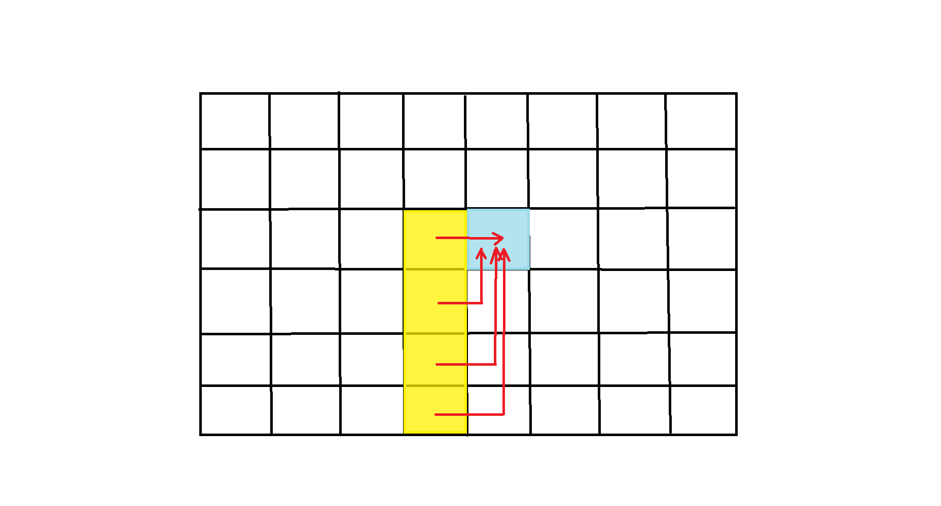 如下图所示, \(f(0, c), f(1, c), ..., f(r, c)\) 都能给 \(f(r, c+1)\) 贡献一个独特的到达方案,所以