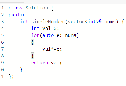 思路:相同的数字异或为零,则可以初始化一个int val=0;,然后用迭代器范围for对这个数组迭代,并用val异或每次迭代到的数,最后val的值便是只出现过一次的值。