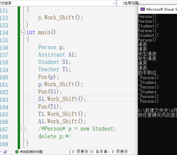 有一个比较奇怪的地方,就是用菱形继承虚继承以后,若这个继承体系中包含虚函数就会报错,显示虚函数的不明确继承。可能是由于最后的派生类虚继承了两个需要重写的虚函数,所以当屏蔽一个虚函数后程序可以运行,但是被屏蔽的多态不能使用,