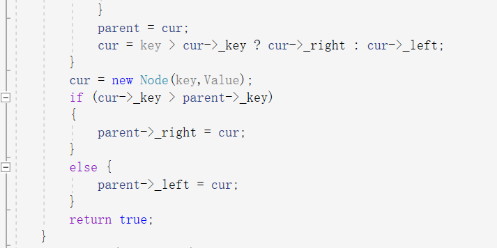 值得注意的是:迭代后存数据的节点放入数据后还没完,还要将当前节点的双亲结点的子节点指向插入的节点,使之跟二叉搜索树连接起来,所以在迭代的时候需要记录当前节点的上一个节点。