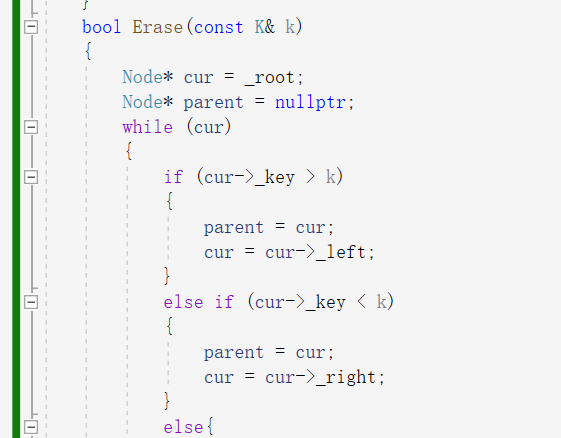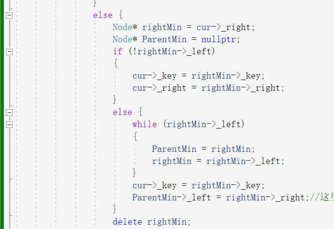 但是这其中又有需要注意的一点,就还是根节点问题,一棵二叉搜索树的右子树的最小节点除了最右边的节点为,若是此子树为根节点的一颗子树为空的子树,那么这颗二叉搜索树的最小节点为根节点,若是按照上面的算法去访问根节点的左子树,就又会出现非法访问空结点的错误,所以需要加一种条件判断,若根节点的左子树为空则直接让其双亲结点链接此树的根节点,此时这个小问题就解决了。