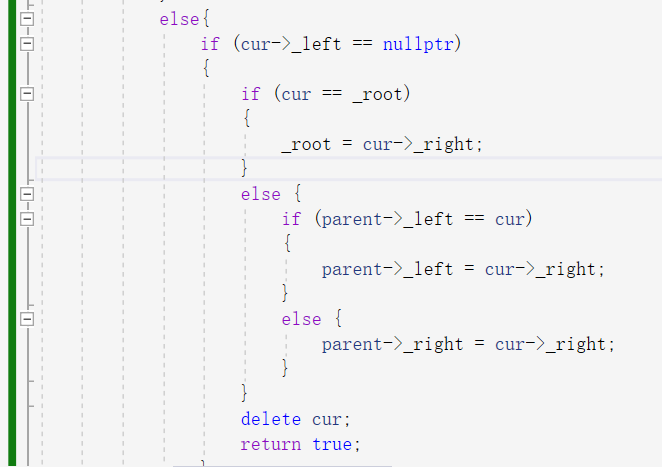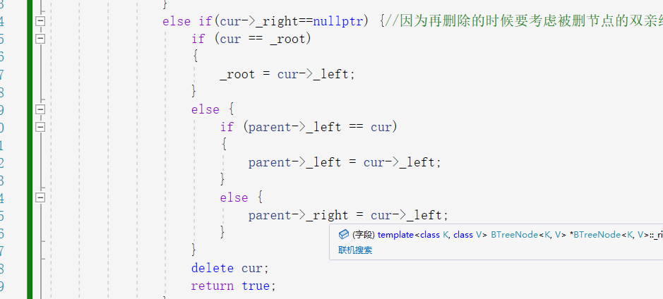 还有需要注意的第二点,若是此时被删除的节点为根节点,所以他没有记录的双亲结点,因为开始定义的双亲结点为空,按照上面说明的算法,就会出现双亲节点空指针访问的错误。因此此情况需要特殊处理,可以直接释放掉根节点的空间,再让根节点指向其一个非空的子树。