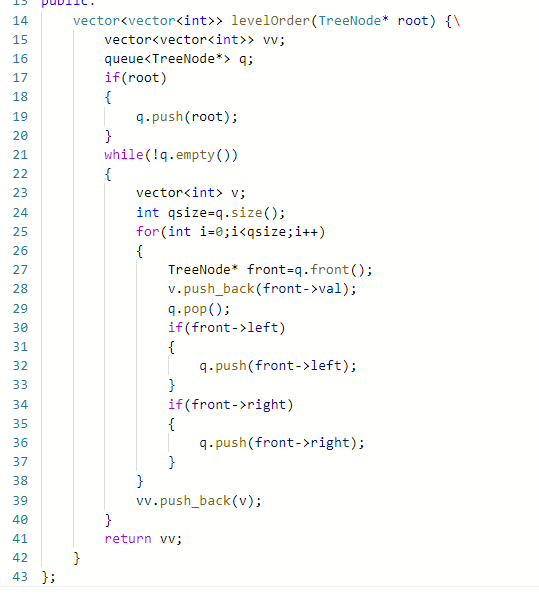 那么如何将每层的节点准确的放入vector中的每一个vector中呢,观察每个节点出队列的规律可以发现,出队列是按照层序出的,且每当上一层数据全部出队列后,下一层数据已经入队列了,且队列中的元素刚好等于下一层的元素,那么可以在外层循环中嵌套一层循环控制队列一次将此层的数据全部出队列,次数为进入外部循环时队列的的数据元素量。此变量可以有队列的size()函数获得,然后将每次内循环的数据尾插到一个定义好的vector中,当内循环进行完成时将这个vector又尾插到最终要返回的双重vector中。此时题就完成了。