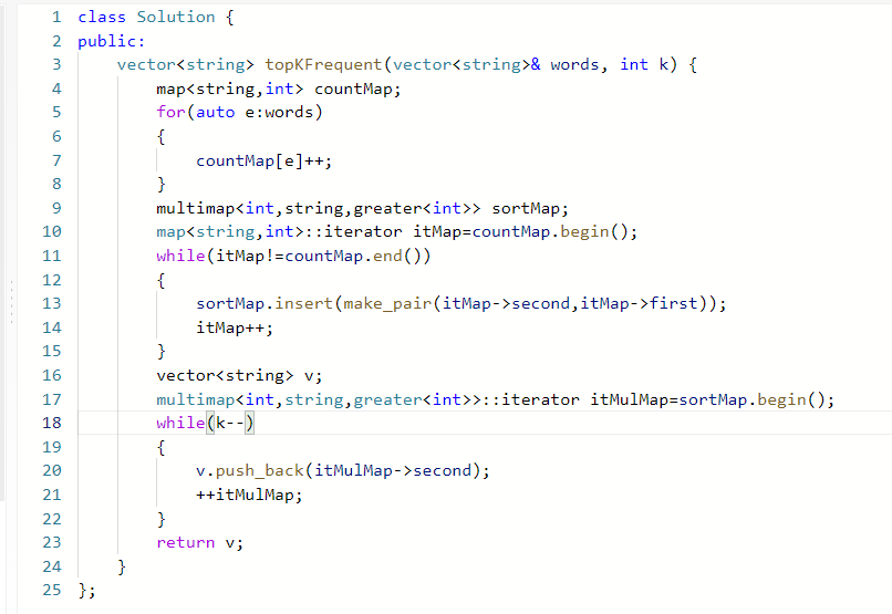 言归正传,因为快排可能会破坏map的中键的字典序列,所以不能用快排,这时multimap就派上用场了,将map中的数全部入到multimap类型的sortmap中,对于相同的数据,他不会破坏已有的顺序,所以只需要降序出前k个sortmap中的数据放入定义的vector中即可。