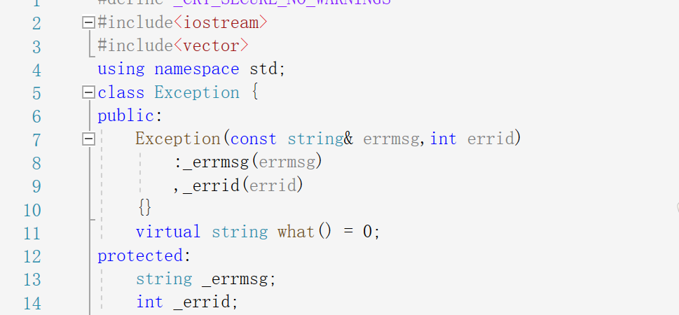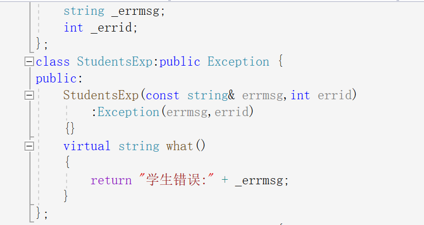 然后是一个虚函数,最好是纯虚函数,因为一定要用多态去捕获异常,所以这个虚函数必须重写.用what函数去详细描述异常情况.
