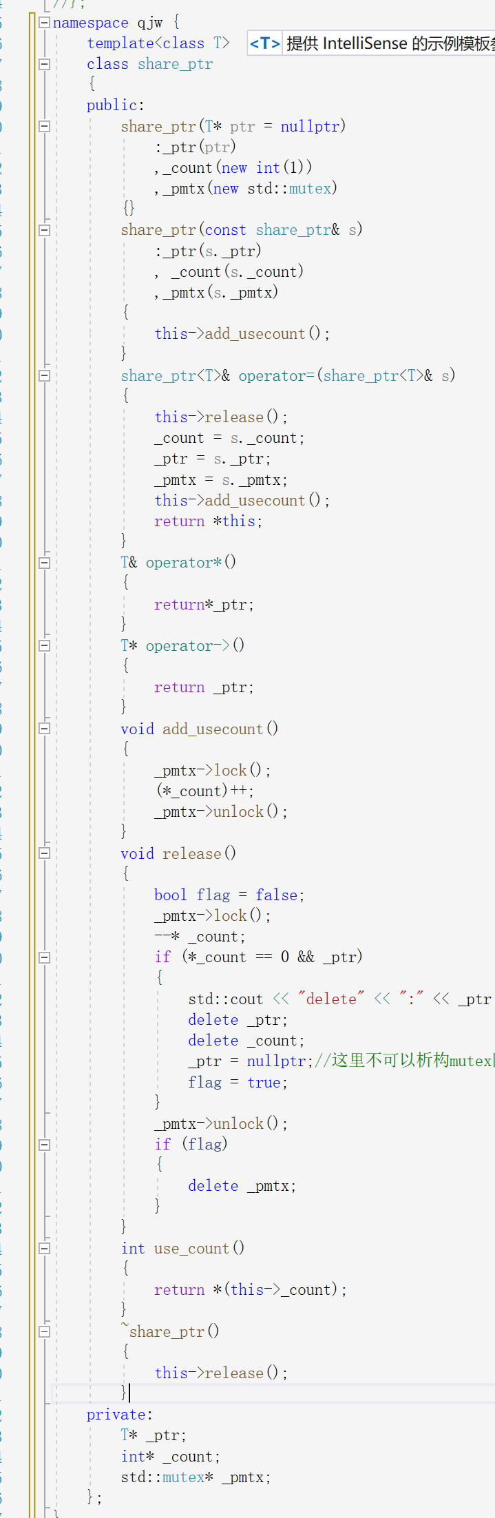 需要注意的是智能指针不可以去拷贝构造,和使用深拷贝运算符,因为这个类是代理管理这个指针,如果拷贝出来一个另外的指针,这算什么?,算弄出来一个没用的空间?也不可以浅拷贝,这关乎到哪一个指针有析构的权利这个问题,开辟空间的地址只有一份,若是有很多个地方都在用这个智能指针,一个析构了就全崩了.