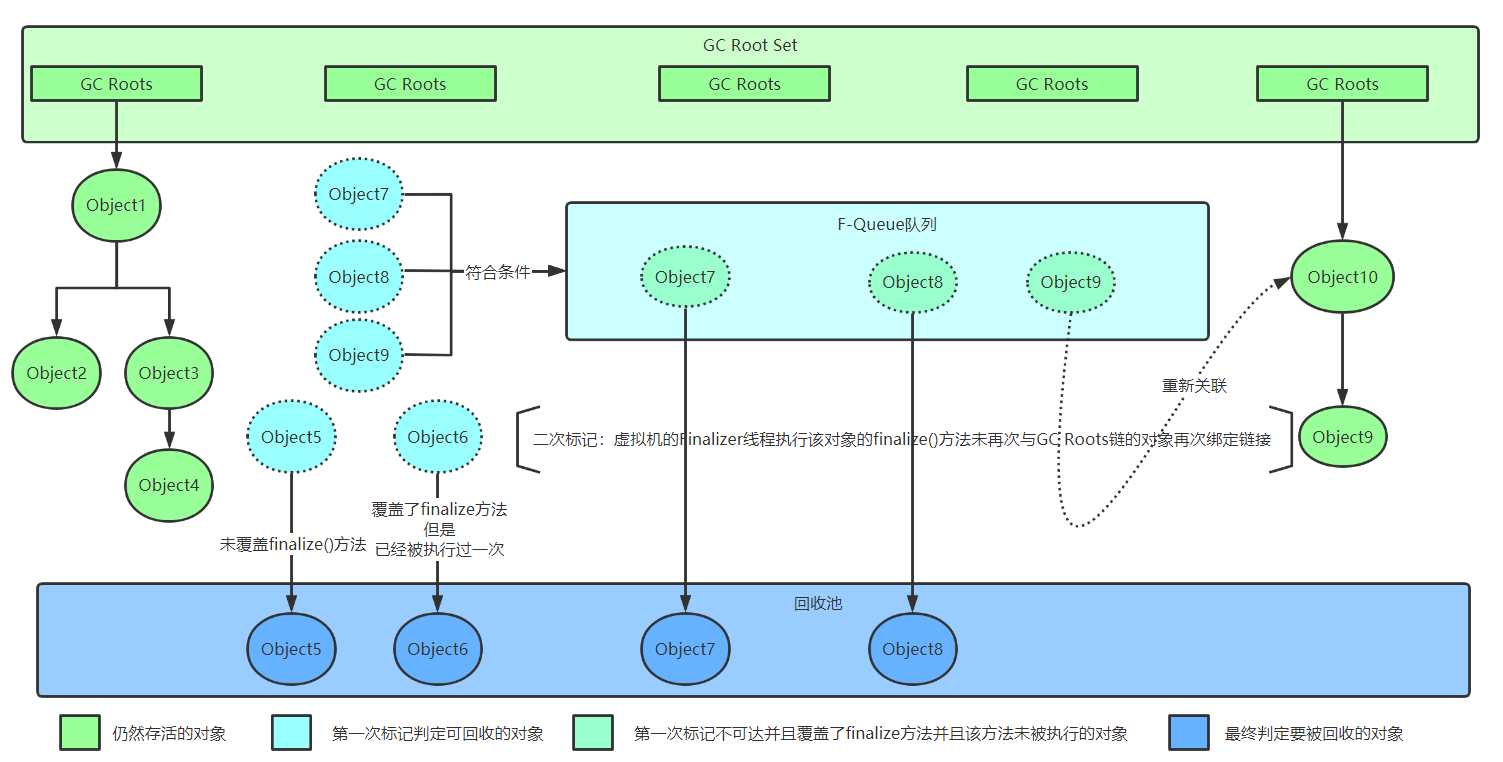 - 第一次被标记后会进行一次筛选,筛选的条件是此对象是否有必要执行finalize()方法:假如对象没有覆盖finalize()方法,或者finalize()方法已经被虚拟机调用过(一个对象的finalize()方法最多只会被系统自动调用一次),那么虚拟机将这俩种情况视为“没有必要执行”;