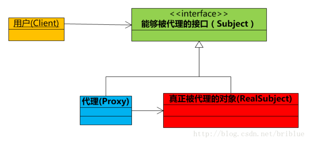 3. 代理就是上图中的 Proxy,由于它实现了 Subject 接口,所以它能够直接与用户接触。