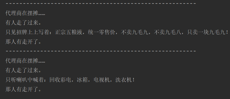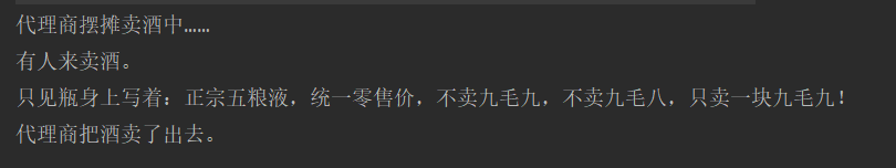 package dynamicProxyDemo; public class SellWuliangye implements SellSomething { @Override public void sell() { System.out.println("只见招牌上写着:正宗五粮液,统一零售价,不卖九毛九,不卖九毛八,只卖一块九毛九!"); } }