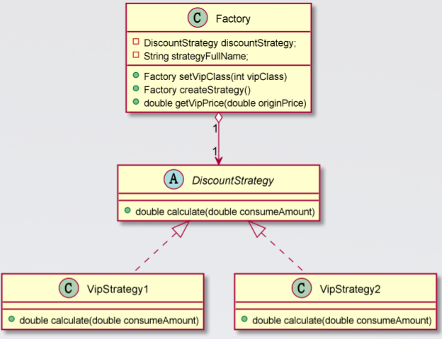 public class Factory { private DiscountStrategy discountStrategy; private String strategyFullName; public Factory() { } public Factory setVipClass(int vipClass) { strategyFullName = "练习.strategy.mystrategy.VipStrategy" + vipClass; return this; } public Factory createStrategy() { try { Class c = Class.forName(strategyFullName); this.discountStrategy = (DiscountStrategy) c.newInstance(); } catch (ClassNotFoundException e) { e.printStackTrace(); } catch (InstantiationException e) { e.printStackTrace(); } catch (IllegalAccessException e) { e.printStackTrace(); } return this; } public double getVipPrice(double originPrice) { return discountStrategy.calculate(originPrice); } }
