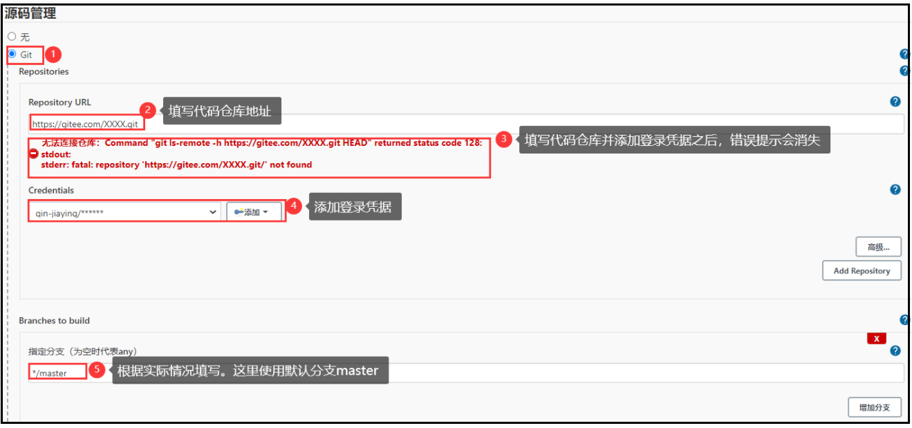 选择 Git —> 添加代码仓库地址 ->添加登录代码仓库的凭据(账号信息)->指定分支(使用默认值)