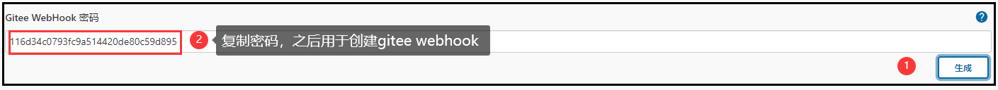 选中之后会出现一些配置项,其他都不管使用默认值。找到 Gitee WebHook密码,点击生成。