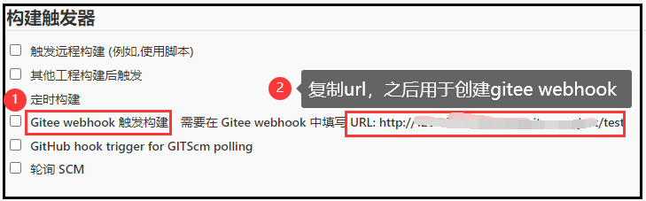 选择“Gitee webhook 出发构建” .(如果没有安装gitee webhook插件这一项是没有的)