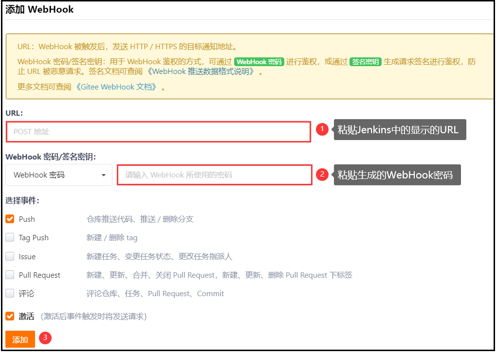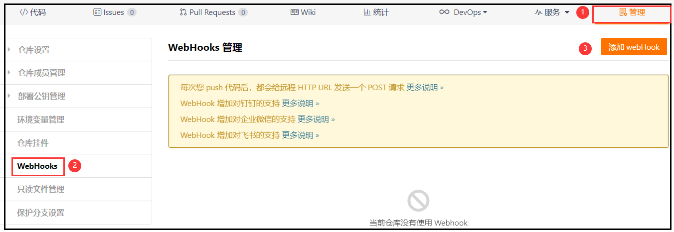添加Gitee WebHook:进入代码仓库->管理->WebHook->添加WebHook