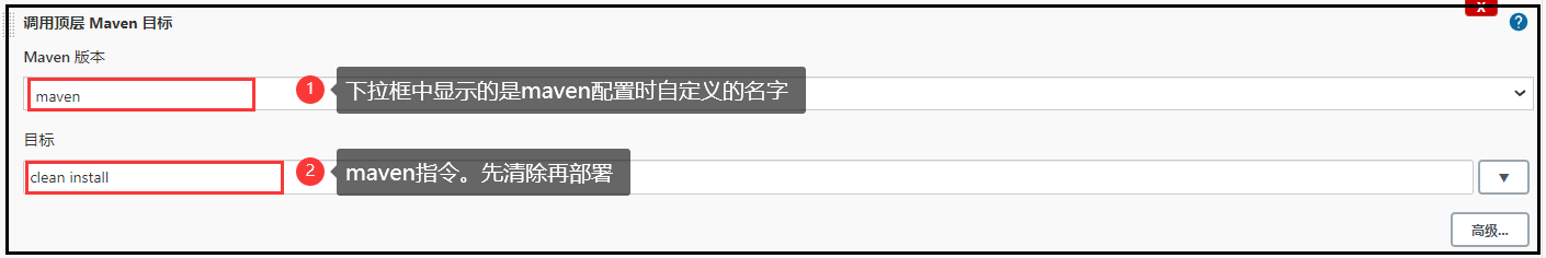 下拉框中选中“调用顶层maven目标”(注意:如果没有在全局工具配置中设置maven这一项是没有的)