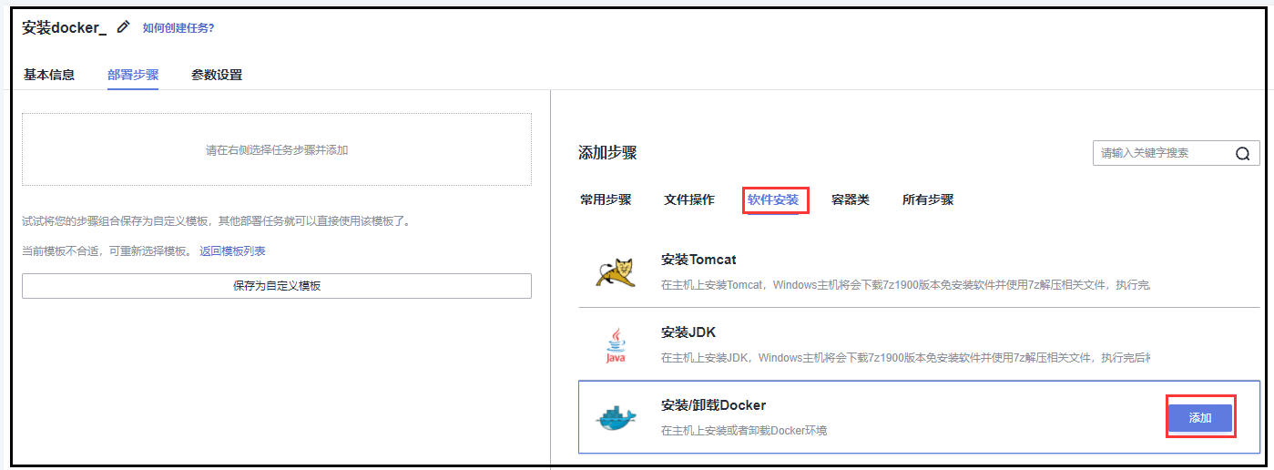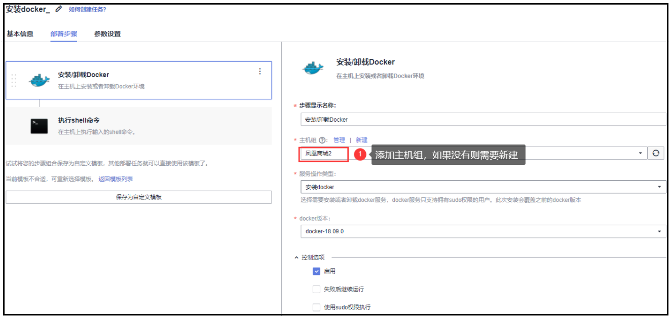(1)基于空白模板创建一个新的部署任务,用于安装docker(如果云服务器上已经安装有则不需要重新安装)