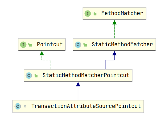 // spring事务的pointCut实现是TransactionAttributeSourcePointcut(改对象在BeanFactoryTransactionAttributeSourceAdvisor中创建)