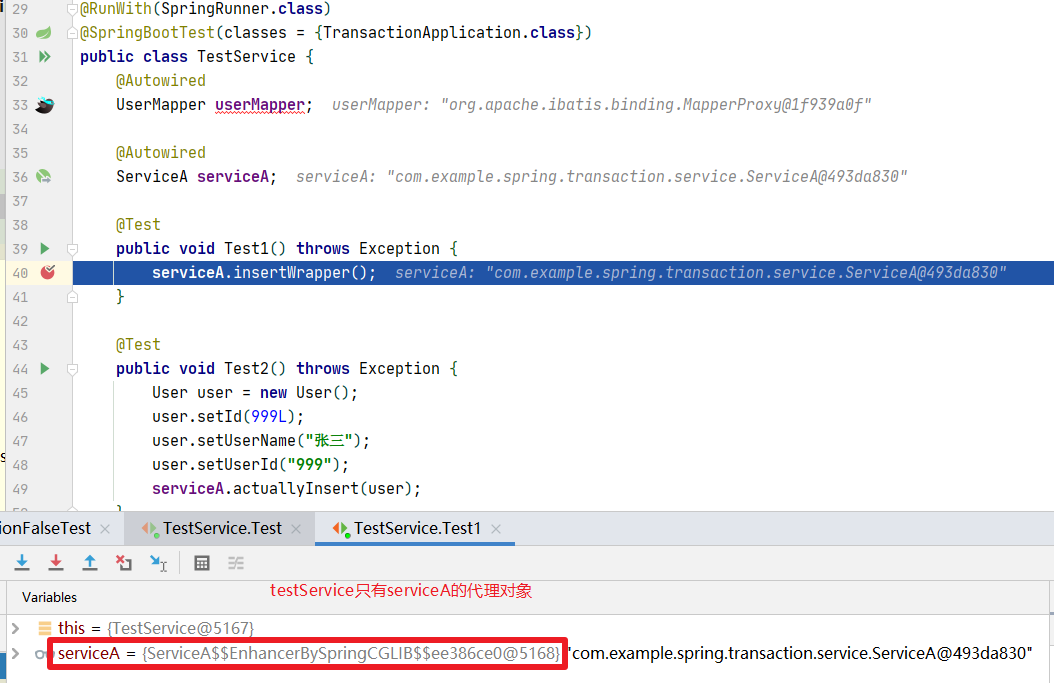 // 进行断点调试,会发现当前this对应指向的是ServiceA对象本身而不是ServiceA的代理对象。class文件中,会执行this。insert(user),所以不会触发aop增强逻辑
