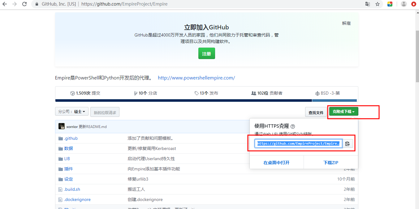 直接在github网站搜索Empire,找到对应的安装链接,复制链接到kali完成下载克隆