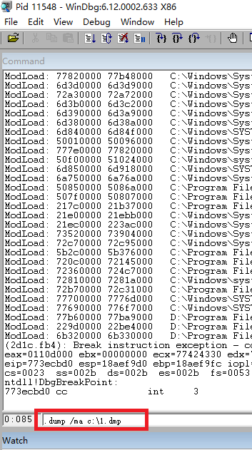 2)在上图红色区域的输入框内输入产生dump 文件的命令 .dump 。可以选择不同的参数来生成不同类型的dump文件。