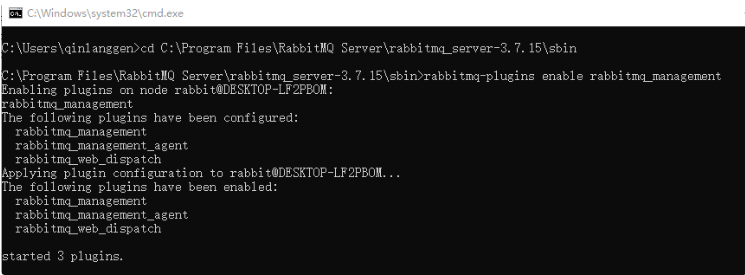 打开 ``cmd ``窗口,cd 到安装rabbitmq 的目录文件夹sbin, 例如:C:\Program Files\RabbitMQ Server\rabbitmq_server-3.7.15\sbin