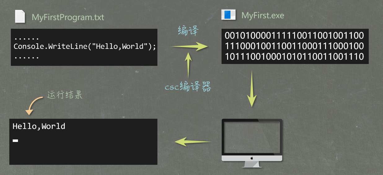 2.实现的过程code-compile-run,我们需要先编写一段代码也就是code,在用开发工具编译计算机语言成为机器语言,最后进行运行