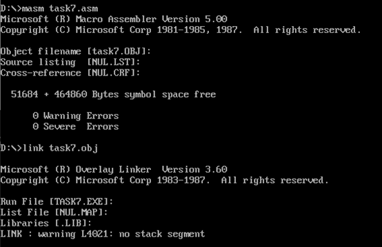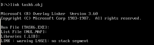 使用masm、link,汇编、链接,得到可执行文件task6.exe。运行程序。结合程序运行结果,理解程序功能。