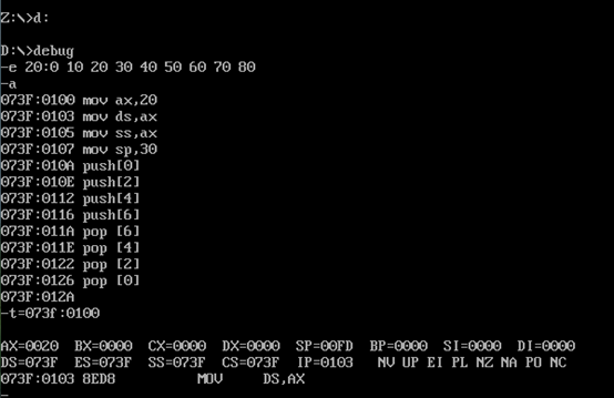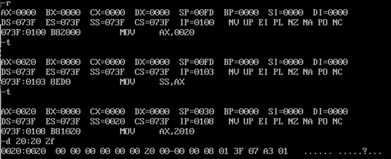 先使用f命令,把00220H ~ 0022fH区间的16个字节内存单元值全部修改为0。并使用d命令查看确认。然后,使用a命令、r命令、t命令写入汇编指令并单步调试。