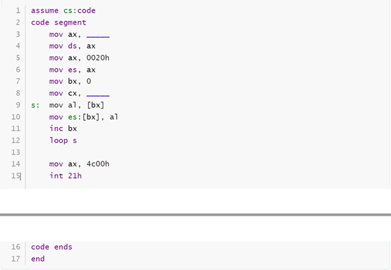 第一空:ds是复制的目标地址,cs是代码开始的地址。“完成自身代码的自我复制”。也就是从cs开始复制。把cs赋给ds即可。