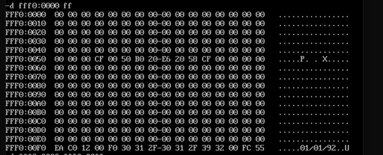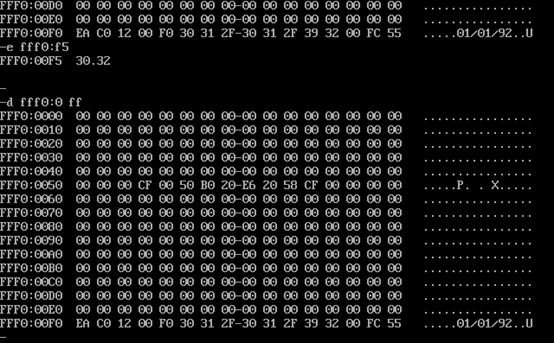 PC机主板上的ROM中有一个生产时期,在内存FFF00H ~ FFFFFH的某几个单元中,请找到这个生产时期,并试图修改它。