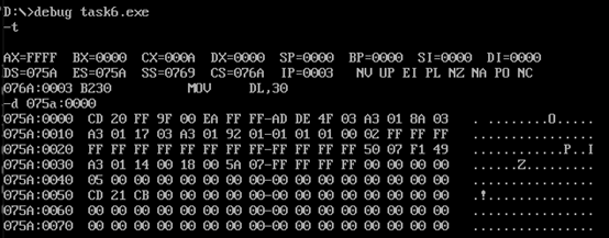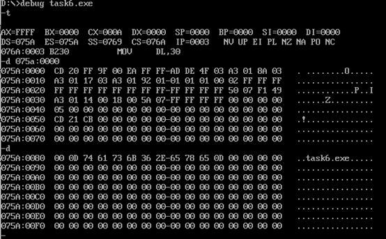 使用debug工具,调试task6.exe。根据第4章所学知识,任何可执行程序在执行时,都有一个引导程序负责将其加载到内存,并将CPU控制权移交给它,也即将CS:IP指向可执行程序中第一条机器指令。在加载可执行程序时,可执行前面512字节是程序段前缀PSP(Program Segment Prefix),用于记录程序一些相关信息。在debug中,使用d命令,查看task6.exe的程序段前缀,观察这256个字节的内容,验证前两个字节是否是CD 20。