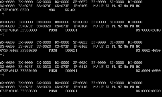 问题2:根据汇编指令,前三条指令执行后,00220H ~ 0022fH被设置为栈空间。并且,初始时,已通过f命令将初始栈空间全部填充为0。观察单步调试时,栈空间00220H ~ 0022fH内存单元值的变化,特别是图示中黄色下划线表示出的数据值。根据实验观察,尝试思考和分析原因。