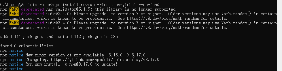 安装后,可使用npm install 安装其他newman、yarn等,若出现如下提示