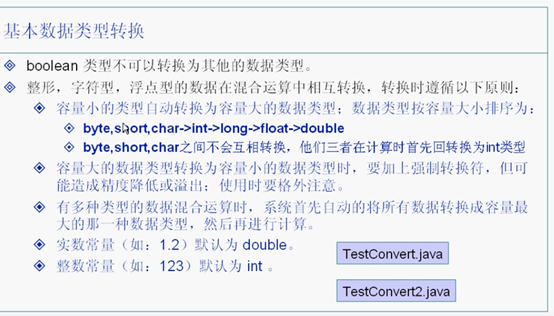 public class TestConvert { public static void main(String arg[]){ int i1 = 123; int i2 = 456; double d1 = (i1+i2) * 1.2;//系统将转换为double型计算 float f1 = (float)(i1+i2) * 1.2;//需要加强制转换符 byte b1 = 1; byte b2 = 2; byte b3 = (byte)(b1 + b2);//系统将转换为int型计算,需要强制转换符 double d2 = le200; float f2 = (float)d2;//会产生溢出 System.out.println(f2); float f3 = 1.23f;//必须加f long l1 = 123; long l2 = 3000000000l;//必须加l folat f = 11+12+f3;//系统将转换为float型计算 long l = (long)f;//强制转换会舍去小数部分(不是四舍五入) } }